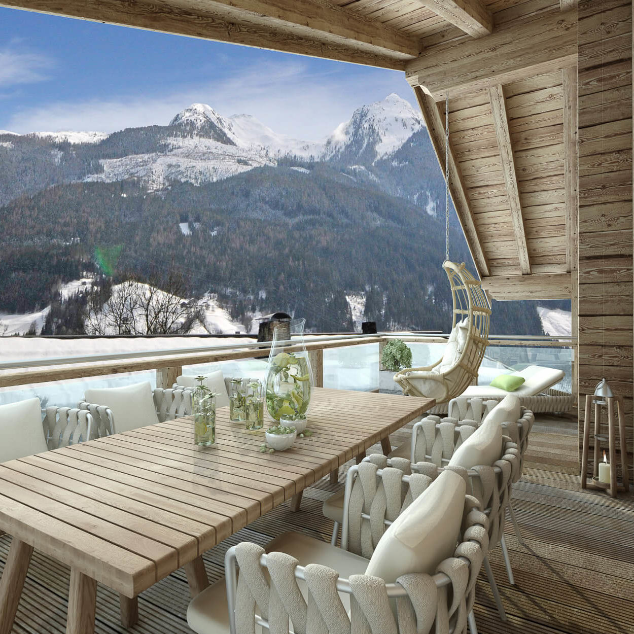 Onze chalets liggen perfect: vlakbij bij de lift, midden in het centrum van het dorp. Vanaf het terras kijk je uit op de kerktoren en de imposante toppen van Nationalpark Hohe Tauern.